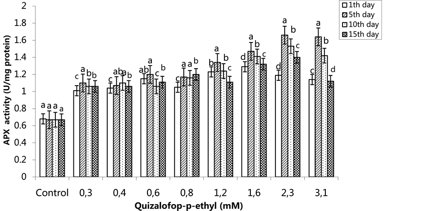 Figure 3. Changes in APX activity in H. annuus leaves exposed to post-emergence quizalofop-p-ethyl application. Vertical bars represent standard error of average of three replications. Data followed by different letters are significantly different from each other (p < 0.05) according to Duncan’s test.