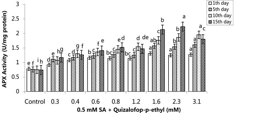 Figure 4. Changes in APX activity in H. annuus leaves after pre-emergence 0.5 mM SA and post-emergence quizalofop-p- ethyl application. Vertical bars represent standard error of average of three replications. Data followed by different letters are significantly different from each other (p < 0.05) according to Duncan’s test.