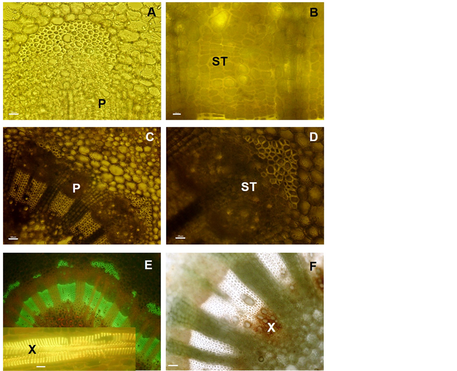 Figure 3. Transverse light micrographs of (A) healthy “Cabernet Sauvignon” peduncle showing phloem tissues, (B) higher magnification of phloem (A) with phloem sieve tubes, (C) necrotic phloem tissues of peduncle from clusters afflicted with SOUR shrivel, (D) higher magnification of phloem (C) with dead phloem sieve tubes, (E) xylem of peduncles in healthy clusters, and (F) xylem of afflicted clusters showing reddish brown discoloration. Scale bars: 50 µm (A), 25 µm (B), 50 µm (C), 25 µm (D), 10 µm (E) and 50 µm (F). P = Phloem, ST = Sieve tubes X = Xylem.