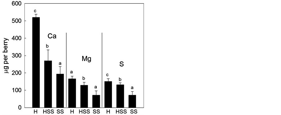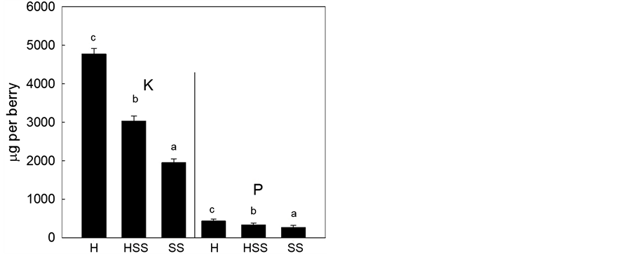 Figure 1. Amount of K, P, Ca, Mg, and S per berry in perfectly healthy clusters and afflicted clusters with healthy appearing and SOUR shrivel berries. Within a nutrient, bars (Mean ± SE) with different letters are significantly different by Fisher’s least significant difference test at P ≤ 0.05. (n = 50 vines). H―Berries of perfectly healthy clusters, HSS―Berries from SOUR shrivel cluster that appear healthy, SS―SOUR shrivel berries. Long vertical lines distinguish one nutrient from the other.