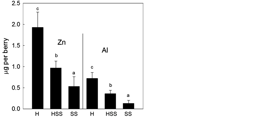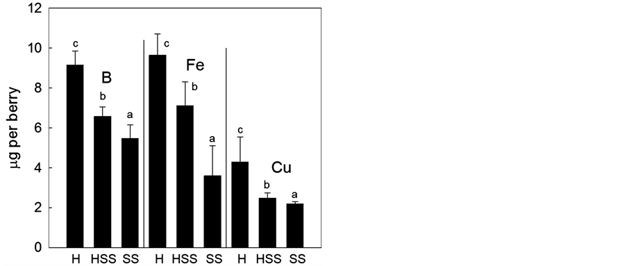 Figure 2. Amount of B, Cu, Fe, Zn, and Al per berry in perfectly healthy clusters and afflicted clusters with healthy appearing and SOUR shrivel berries. Within a nutrient, bars (Mean ± SE) with different letters are significantly different by Fisher’s least significant difference test at P ≤ 0.05. (n = 50 vines). H―Berries of perfectly healthy clusters, HSS―Berries from SOUR shrivel cluster that appear healthy, SS―SOUR shrivel berries. Long vertical lines distinguish one nutrient from the other.