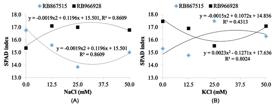For stress with KCl, the two varieties also responded differently (Figure 1(B)). With the addition and increasing of the priming concentration, the plants RB966928 presented a decrease in the chlorophyll index, up to the concentration of 25.0 mM, and at the concentration of 50.0 mM, the plants showed an increase