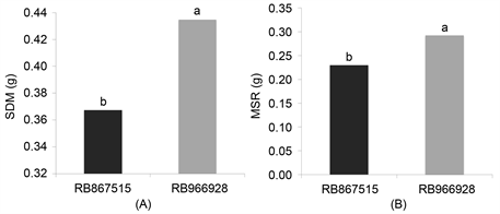 For the variables: shoot dry matter (SDM) and root dry matter (RDM) there was a significant difference only between the varieties (Table 1). The variety RB966928 presented higher SDM and RDM in relation to the variety RB867515, regardless of the treatment used (Figure 2).