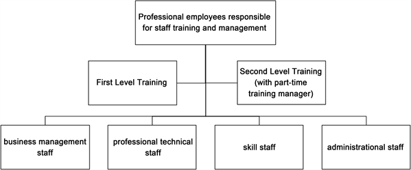 The human resource department has two professional employees responsible for staff training and management [6] . The enterprise training levels are divided into first level (enterprise level) and second level (department level, group level). Each department has a part-time training manager in charge of organizing department-level training and supervising the implementation of training. The employees undergoing training (trainees) are divided by the level of position into business management staff, professional technical staff, skill staff, and administrational staff (The training contents mainly include national laws and regulations, corporate management system and program documents, positional theories and knowledge, practical operational skills, technical standards, typical quality cases, safety education, and admission training [7] . For professional technique and skill training, new employees would be tutored by old employees and given one month of apprentice. New employees would be guided and instructed by old employees with more than 3 years of service in a one-to-one way and taught with the operational skills and experiences at the corresponding position [8] . As for corporate management system, regulation and safety training, relevant leaders are organized to give 2- to 3-h lectures once every half year, and then all employees are provided with relevant materials for learning and review later. The trainees are checked through written examination [9] . As for technical standard training, the company invites a foreign expert to give a 3-day training every two months, 2 hours each day, and plans 2 hours of training off work for the employees. The company’s training system is shown in Figure 1.