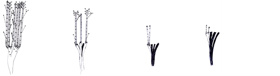 Individual’s senile age (s) submitted 1-2 elongated shoots from dormant buds unfolded, preserved in the living areas of the axes, and heavily damaged parts of the main root. Spear bears 2 - 6 pairs of leaves juvenile type. Post generative period lasts for 2 - 3 years (Figure 3).