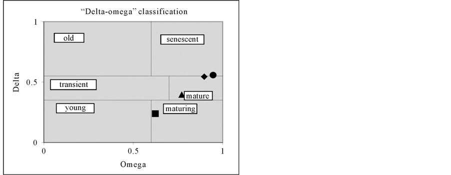 Structure of coenopopulations was studied by conventional methods [14] [16] [17] . In each coenopopulations 10 to 15 plots with 1 m2 were allocated. Ontogenetic structure of populations defined as the ratio of populations of individuals of different developmental states. For the unit of account is taken individual. Characterization the population structure based on the idea of the typical ontogenetic spectrum [18] . Coenopopulations are characterized by the classifications of and “delta-omega” of [19] . Density is defined as the number of plants in 1 m² area [20] , the names of vascular plants led by Czerepanov [21] (Figure 2).