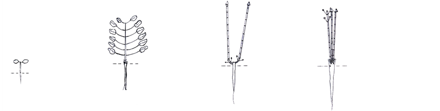stalks. Leaf blade obovate, its length and width 0.2 - 0.3 cm, 0.3 - 0.5 cm. Epicotyl length of 10 - 20 mm. The main root reaches 2.0 - 3.0 cm, branched and lasts a few weeks.