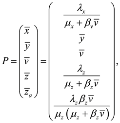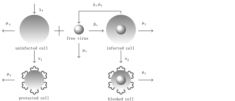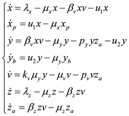 Let x represent the susceptible cells, i.e. the cells that can be infected with HIV, and define y as the cells that are already infected. In addition, assume that v represents the free viruses in the body, z denotes the defense cells (CD8+ T and B) and