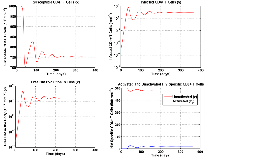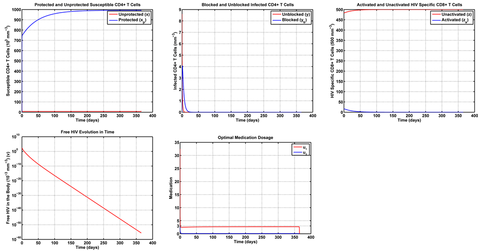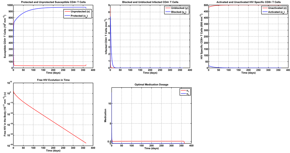 Figure 5 conveys a numerical simulation of the uncontrolled model in Equation (1), solved by means of the Finite Difference Method, for a one year period. Note that the solution represents the typical behavior of the immune system in the presence of HIV [9] [21] - [23] . The system rapidly approaches the non-trivial equilibrium point.