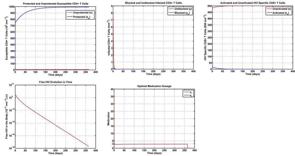 Note in Figure 6 that the first week of treatment causes a substantial decrease in the unprotected (susceptible) CD4+ T cells, with an increase in the number of protected cells. That is because the treatment makes most of these cells become protected cells. Note that, since the medication efficiently fights the infection, the number of HIV-specific CD8+ T cells can be reduced with respect to the uncontrolled dynamics in Figure 5. That leaves the imune system free to combat other infections. With regards to the infected cells, blocked and unblocked, they rapidly vanish. Note that the unblocked cells vanish more rapidly than their blocked counterparts. Note also that the number of remaining viruses rapidly decays to zero, its trivial equilibrium point. It is also noteworthy that the optimal dosage of the transcriptase inhibitor