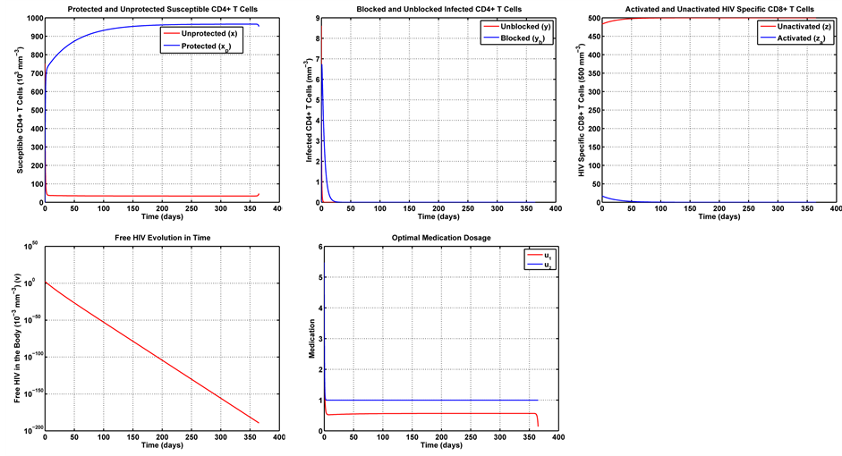 The optimal control problem in Equation (20) was solved for a one year treatment period. The initial condition for the state variables was obtained by running the uncontrolled system in Equation (1) for a one year period. The last value of each variable (after 365 days) was taken as the initial value for the same variable in the controlled problem. In this work, we first consider Case 1, with