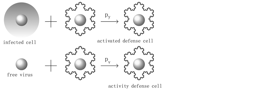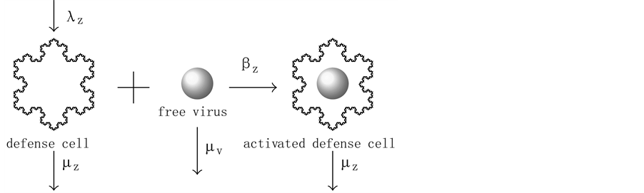 The virus replication mechanism is depicted in Figure 1. Observe that free viruses (v) and uninfected cells (x, CD4+ T) produce infected cells (y) that, in turn, produce new free viruses. Figure 2 illustrates the activation of the defense cells (z, CD8+ T). Note that they are activated in the presence of free viruses.