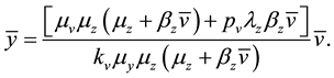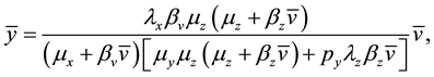 . As for the infected cells y, they are produced from the interaction of their uninfected counterparts and the viruses, at rate