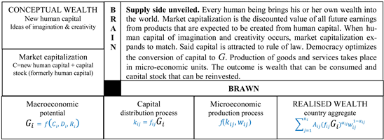 Capitalism is a macro-economic activity measured by market capitalization as an expression of confidence in human capital. Market capitalization is the discounted value of all future earnings from products that are expected to be created from human capital. Therefore, it takes into account current and all future years. Assuming perfect D and R, then simultaneous with the appearance of human capital (brain) is an increase in market capitalization. Simultaneous with the distribution of market capital to investee companies, said products are created in individual micro-economic units of production that employ capital stock and corporeal physical labor (brawn). This operating definition of homogenous labor is consistent with the original theory of comparative advantage (Ricardo [25] ).