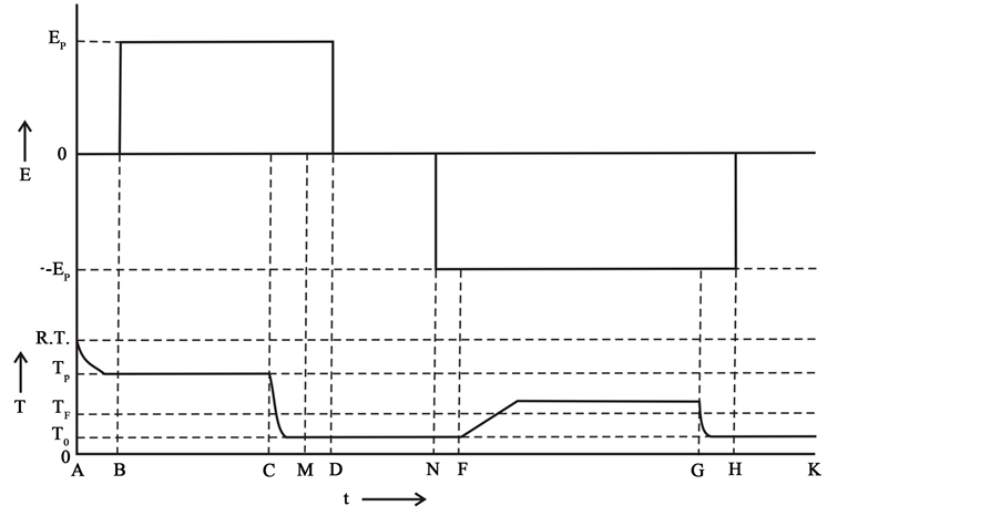 . At the point N, the polarizing electric field EP will be applied in the opposite direction with reversed polarity. At the point F of Figure 2, the specimen will be slowly heated to a temperature slightly higher than
