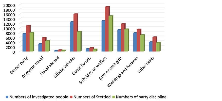 The effectiveness of the eight provisions can be evaluated from three perspectives. First, the characteristics of the prosecution and punishment, which is investigated the highest frequency, which is the lowest frequency, what is the reason? Second, the overall investigation of the eight provisions of the diachronic trend, that is, dynamic performance evaluation. Third, the administrative level, that is, the distribution of cadres at the provincial, prefectural, county, and township level violated the eight provisions. This paper evaluates eight provisions from these three perspectives on its effectiveness and implementation, and strives to dig the reasons behind the figures, to pave the way for the logical analysis.