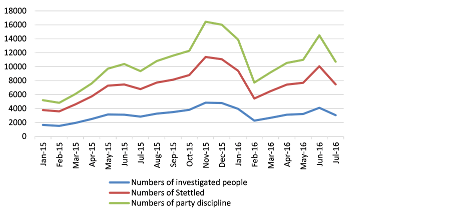 With the strict implementation of the eight provisions at the grassroots level, the number of township-level investigated fell from the peak of 5919 people (November 2015) to 2819 people (in February 2016), the decline rate reached 52% (Figure 7). The number of Investigated cases and people changes in one after another, reflects the consciousness awakening of dare not, can’t, don’t want