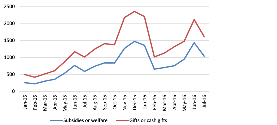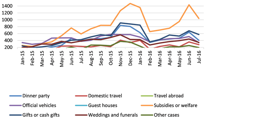 peak (investigated number reached 6565 people). After the end of December 2015, the investigated number shows significantly down, in February 2016, the number of investigated people from the peak 6565 down to 3180 people. From February 2016 to June the same year, the number of investigation increased significantly month by month, in June 2016 reached the peak of 5959 people. What are the reasons for these data? First, from the specific analysis of the illegal allowances and subsidies or welfare, and illegal gifts or cash gifts at the end of 2015 to early 2016, we can find that November, December, January have the largest investigated number, both reached its peak In December 2015 (Figure 3). Since the implementation of the eight provisions, the central and local authorities at all levels to fix the program, the annual meeting has been greatly reduced, but the annual subsidies and welfare behavior is still uncommon. Although the benefits of the specification may not be as high as usual, which is also contrary to the original intention of the eight provisions. A large number of investigated cases indicate the seamless, uninterrupted efficacy of eight provisions.
