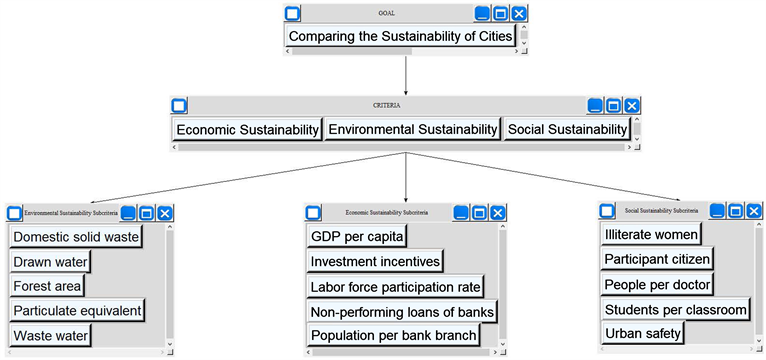 The goal exists at the first level of the hierarchy that is comparing the sustainability of cities in Turkey. Since sustainability is considered with three components economic, environmental and social sustainability are presented at the second level of the hierarchy as criteria. At the third level of the hierarchy, five sub criteria under each criterion are placed.