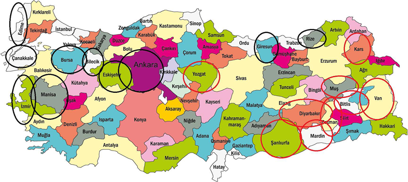 represented in Figure 2. The top ten provinces that received the highest sustainability scores were shown in the black circle and the provinces with the lowest scores were shown in the red circle. The map illustrates the geographical distribution of sustainability scores. Diyarbakir, Mardin, Muş, Kars, Bitlis, Yozgat, Sanliurfa, Van, and Batman are less sustainable cities that are located in the eastern part of the country. The provinces with high sustainability scores are mostly located in the western provinces.