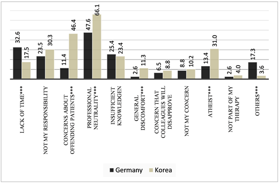 significantly different between Korean and German respondents (66.1% vs. 47.6%: p < 0.001). German psychiatric staffs reported the lack of time as the second obstacle, whereas Korean psychiatric professionals mentioned their concern that religious and spiritual factors could offend psychiatric patients (respectively p < 0.001).