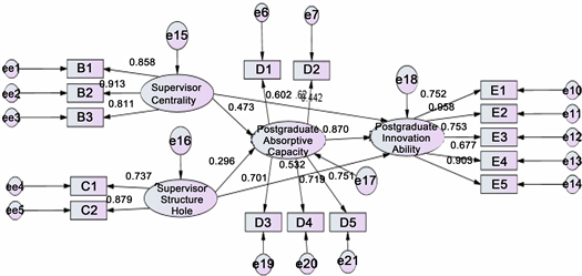 capacity and postgraduate innovation model parameters are estimated through the test. The test results show that (as shown in Table 3), Supervisor centrality, supervisor structure hole and the postgraduate absorptive capacity of the standard path values were 0.473 and 0.296, and the P value shows that the path passes the significance test, thus supporting the hypothesis of this study H1a and H1b; the standardized path values of the supervisor centrality, supervisor structure hole and postgraduate innovation ability are 0.442 and 0.532, and the P value shows that the path passes the significance test, which supports the hypothesis of H3a and H3b in this study. The standardized path value of postgraduates’ absorptive capacity and postgraduates’ innovation ability was 0.870, and the P value showed that the path was tested by significance test, which supported the hypothesis of H2.