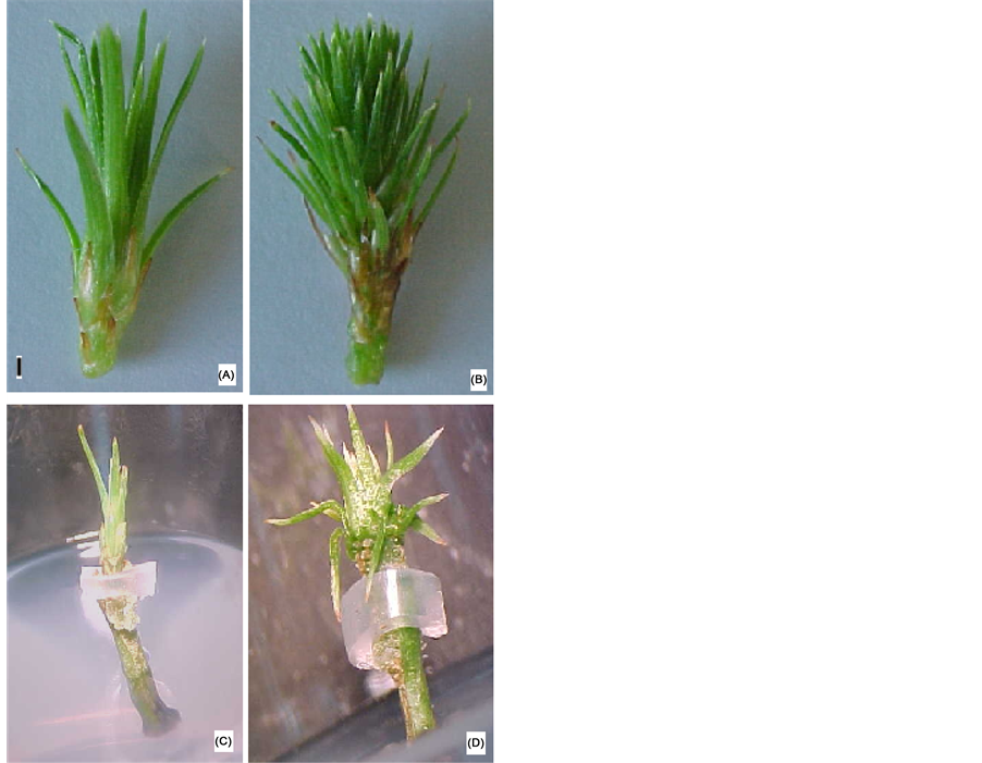 Pinus radiata D. Don is one of the most important forestry species in the world in terms of annual wood production, with almost 25% of the world’s production [1] . Today, this production depends on the ability to generate selected clones in the short term. However, as in many woody species, in Pinus radiata, there is a decline in morphogenetic ability across maturation. Therefore, upgrading forestry programs face the problem of selecting interesting traits during the mature age, while vegetative propagation is only possible during juvenile phases of development [2] . Thus, the decrease of morphogenic capacity with the ontogeny of the source material [3] , affect among others the rooting ability of plant tissue [4] being often a barrier for plant multiplication or regeneration. Several studies conducted in Pinus sp. indicate an ontogenetic gradient of shoot tips morphogenic competence, determined by the vertical localization in the tree crown, where basal meristematic shoot tips present higher morphogenic capacities than apical ones [5] - [7] . It has been suggested that the decline in morphogenic capacity could be due to the loss in competence at the cellular level and it is highly likely that this phenomenon causes changes in gene transcription [8] . In vitro propagation methods may induce reinvigoration of advanced physiological tissue and renewal of ontogenetically adult P. radiata [3] [6] , and in this way avoid the problems associated to the lost of morphogenic capacity. This reinvigoration includes anatomical, molecular and epigenetic changes which reflect characteristic juvenile individual’s protein patterns, DNA methylation and polyamine content [6] [9] . Altogether, the reversion of several adult phenotypic traits towards more juvenile stages and the recovery of tissue morphogenic capabilities allow the cloning of selected adult trees [6] [9] [10] . One tissue reinvigoration techniques is the in vitro micrograft, which has been tested to reinvigorate ontogenetically adult vegetative buds on juvenile rootstocks [11] and can be a solution for cloning adult trees of several species, in which sprouts present deficient rooting and lack of vigor [3] [4] .