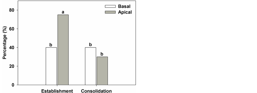 Figure 2. Effect of shoot tips provenance in the ortet on percentage of establishment and consolidation of P. radiate micrografts. Shoot tips were collected from the basal and apical quarter of the ortet crown (9-year-old and ca. 8.8 m tall). Different letters indicates significant differences (n = 20, Wald stat, P < 0.05).