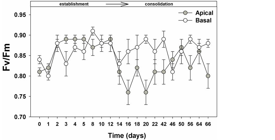 Figure 3. Photosystem II maximal photochemical efficiency (Fv/Fm) of micrografts made from basal and apical shoot tips during in vitro establishment and consolidations phases. Shoot tips were collected from the basal and apical quarter of the adult P. radiate ortet crown (9-year-old and ca. 8.8 m tall). Mean ± SE (n = 10).
