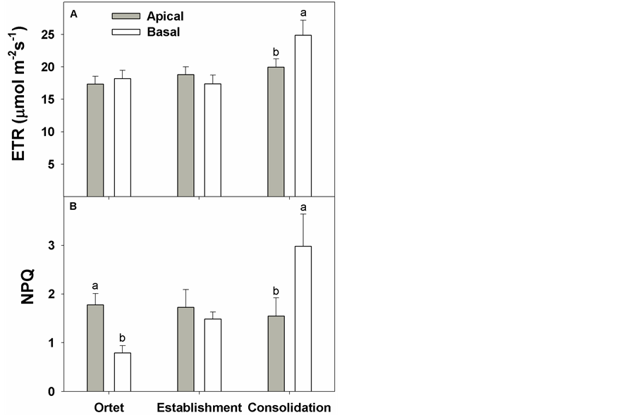 Figure 4. Electron transport rate trough PSII (ETR) (A) and non-photochemical quenching (NPQ) (B) of micrografts made from apical and basal shoot tips collected from adult P. radiate (9-year-old and ca. 8.8 m tall). Values showed in the ortet and during it in vitro micrograft establishment and consolidation phases. Mean ± SE (n = 10). Different letters indicate significant differences between apical and basal shoot tips within each phase (Tukey test, P < 0.05).