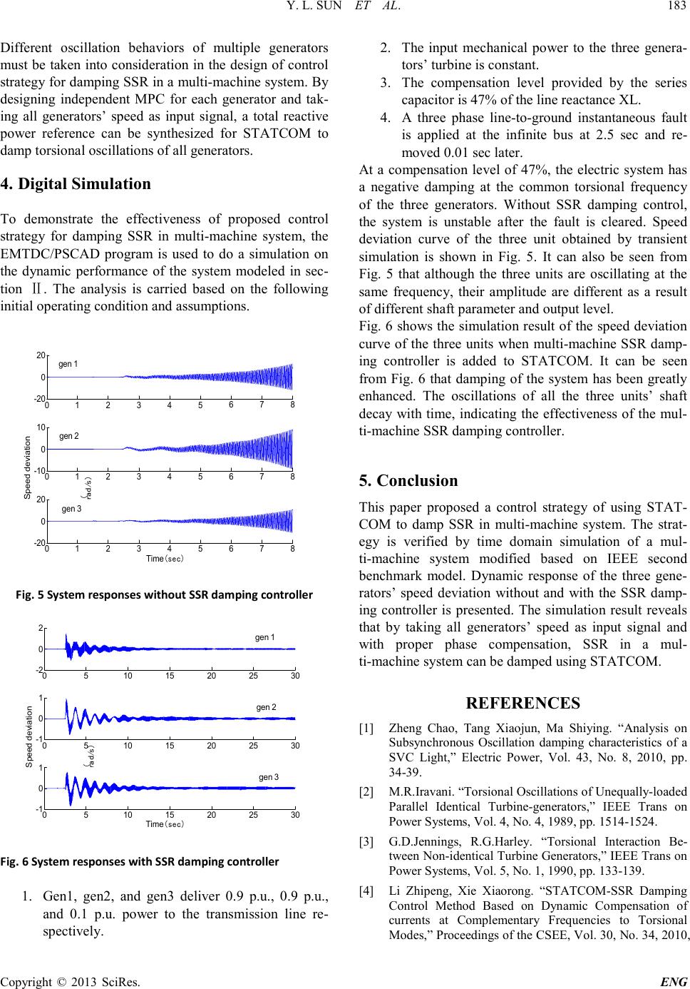 ![]() Engineering, 2013, 5, 180-184 doi:10.4236/eng.2013.51b033 Published Online January 2013 (http://www.SciRP.org/journal/eng) Copyright © 2013 SciRes. ENG Application of STATCOM for Damping Subsynchronous Resonance in a Multi-machine System Yanlong Sun, Liangeng Ban, Daye Yang, Yizhen Wang China Electric Power Research Institute, Beijing, China Email: sunyanlong@epri.sgcc.com.cn Abstract Results of an investigation on the application of STATCOM for damping subsynchronous resonance (SSR) in a mul- ti-machine system is presented in this paper. For a multi-machine system which has a set of identical parallel tur- bine-ge nerato rs or no n-identical turbine-generators having torsional modes of the same frequenc y, generators may suf- fer from the same mode of torsional interaction corresponding to a certain series compensation degrees. Generators in such system ma y have different oscillation beha viors when they are unequally loaded or have different shaft and elec- trical parameters. Serving as the grid-side equipment, the reactive power output of a STAT COM could have an impact on all generators electrical distance nearby. Thus a single STATCOM could be used to damp torsional interactions of multi-generators when additional proper control strategy is supplemented. In this paper, control strategy of using STATCO M to damp SSR in a multi-mac hine sys tem is de signed and its effec tiveness is validated based on a modified IEEE second benchmark model. Keywords: subsynchronous resonance (SSR); multi-machine system; STATCOM; mode partition controller (MPC). 1. Introduction Areas that have an uneven distribution of energy and load need transmission of bulk power over long distance to realize the op timal arrangement of resources. For s uch long distance transmission systems, steady state stability limit is often the bottleneck factor that constrains the transmission capability of the system. Use of series ca- pacitor compensation could reduce the equivalent reac- tance of the transmission line and significantly improve steady state stability limit of the system. Thus, series compensation has been widely used worldwide as a cost-effective measure to improve the transmission capa- bility. However, transmission systems with series com- pensation may have an electromechanical coupling with the nearby turbine-generators, causing subsynchronous resonance (SSR) and cause loss to the fatigue life of the generator shaft. For transmission systems with series compensation, its sendi ng end genera lly ha s mor e than one unit, often with multiple units of a power plant or several power plants having short electrical distance from each other. Thus a system of multi-machine delivered through series com- pensation line is formed. For systems that have parallel identical turb ine-ge nerato rs or non -identical units having torsional modes of the same frequency, generators may suffer from the same mode of torsional interaction at a certain series compensation degrees. Reference [2, 3] conducted a research on the SSR characteristics of two kinds of multi-machine system. Results show that oscil- lation behaviors of unequally-loaded parallel identical generators and non-identical units having torsional mod- es of the same frequency may have different amplitude and phase, relating to their output level or modal para- meter differences. As a new type of reactive power compensation FACTS device, STATCOM has a fast and smooth control per- formance. By applying appropriate control strategies, STATCOM could b e used to damp SSR . Taki ng gener a- tor speed as the input signal, [4] propose a way to excite additional electromagnetic torq ue at the modal frequenc y by injecting controllable compensation current into the generator using STATCOM, thus to damp torsional inte- raction of the generator. Reference [5] take local voltage as input signal and damp SSR by modulating the reactive current reference of STATCOM. By monitoring subsyn- chronous frequency current component in the transmis- sion line and injecting corresponding compensation cur- rent into the grid using STATCOM, these current com- ponents could be prevented from flowing into the gene- rator set, so as to achieve the intention of damping SSR [6]. Various control strategies have been designed to damp SSR using STATCOM in above references, but all these researches are based on the single-machine system, ![]() Y. L. S UN ET AL. Copyright © 2013 SciRes. ENG 181 making these control strategies ap plicable only for sin- gle-machine system and parallel identical generators with same operating conditions [7]. For multi-machine system in which generators have different oscillation behavior, a STATCOM control strategy is proposed in this paper to damp torsional oscillatio ns of all gener ator s. All generator s’ spee d is needed as the input signal to the STATCOM and a reactive power reference is generated through moda l partition controller . Time do main si mula- tions based on a modified IEEE second benchmark mod- el are carried out to validate the effectiveness of the pro- posed strategy. 2. System Modeling In multi machine system, torsional interaction occurs onl y bet we en t ho se un its t ha t ha ve t o rsi ona l mod es of t he same frequency. EPRI suggests that if corresponding torsional vibration frequencies of the units are different from each other more than 1%, the original mul- ti-machine system could be simplified into a sin- gle-machine system by reserving the unit concerned, while replacing other units by its subtransient reactance and a fixed voltage source. In addition, parallel identical generators with same operating conditions can be studied as an equivalent single unit. Therefore, in the study of the multi-machine system SSR, only unequally-loaded parallel identical generators and non-identical units hav- ing torsional modes of the same frequency are consi- dered in this paper. System Ⅱ of the IEEE second benchmark model represents a sy