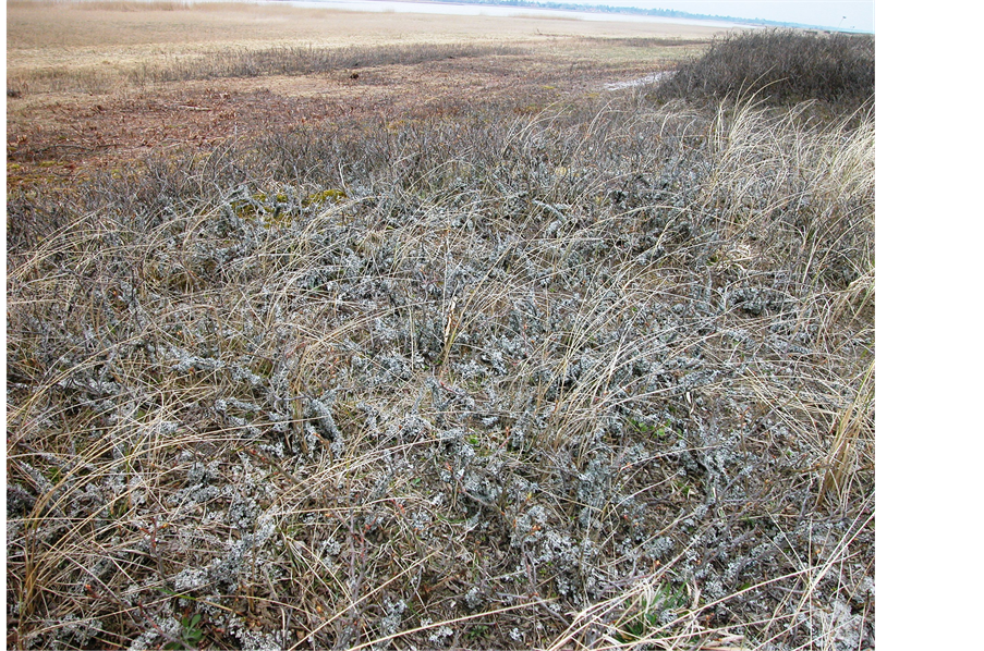 Five 20 m transects passing from open surroundings through living and dead oval shaped Rosa rugosa shrubs at the top of the dune ridge were established. 21 plots (0.5 × 0.5 m2) with a mutual distance of 0.5 m were established along the transects. A total of 105 plots were studied. The vascular plant species as well as the bryophyte and lichen species were recorded for each plot. The rose shrubs varied from dead to vigorous and dense (measuring up to 1.5 m in height), but mainly the lichen vegetation seemed to be responsive to this variation, being far more abundant as epiphytes on twigs and on the ground between the dead roses.