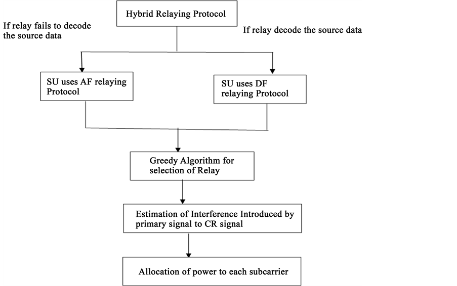Figure 1 represents the proposed block diagram. In our proposed technique, a hybrid relaying protocol is used for efficient allocation of bandwidth and power in the sub-band of CR network. For this SU uses AF relay protocol, only in case it is unable to decode the source data, else it uses the DF relaying protocol. The selection of relay is done using greedy algorithm to achieve optimal solution. After that estimation of interference introduced by primary signal to CR signal. The power allocation is done in order to enhance the possible information rate for the CR network whereas maintaining the instantaneous interference generated to the primary below a pre-defined threshold.
