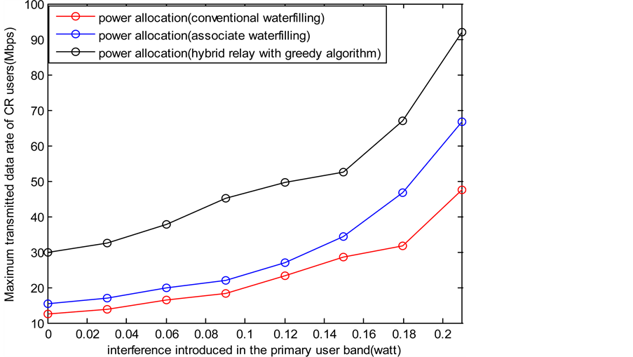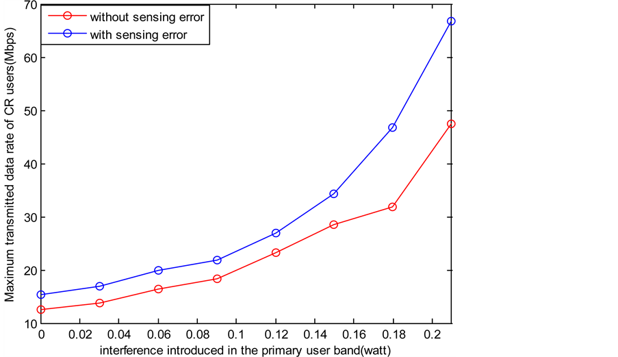 Figure 6 depicts the maximum transmitted data rate of CR user versus the average interference imposed to the primary user band in which the transmit power budget is fixed and set to 3 Watt. This figure shows that the proposed scheme leads to higher CR data rates for a given interference level imposed to the primary user band.