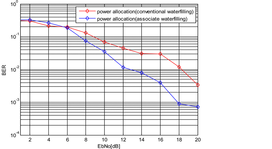 Figure 7 gives the power allocation by associate waterfilling approach. It is observed that power allocation by associate waterfilling approach is better than the power allocation by conventional waterfilling because the reduction of error rate is higher for associate waterfilling method.