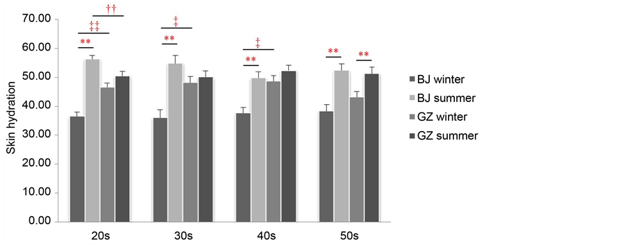 Skin hydration in winter was significantly lower in Beijing women than in Guangzhou women, except for women in their 50s. Although the skin hydration