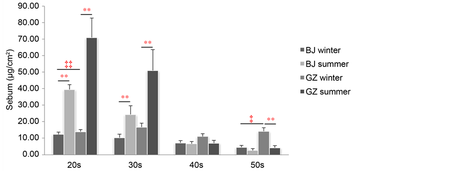 Figure 2. The sebum secretion during winter and summer in Beijing and Guangzhou women (mean ± SE). BJ and GZ respectively indicate Beijing and Guangzhou. *, **; Significant differences between winter and summer, P < 0.05, <0.01. ‡, ‡‡; Significant differences between Beijing and Guangzhou in winter, P < 0.05, <0.01. †, ††; Significant differences between Beijing and Guangzhou in summer, P < 0.05, <0.01.