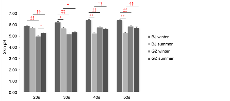 significantly higher in Beijing women than in Guangzhou women. During summer, the skin pH of women in their 20s and 30s was significantly higher in Beijing women than in Guangzhou women, whereas the skin pH of women in their 40s and 50s was significantly higher in Guangzhou women than in Beijing women.