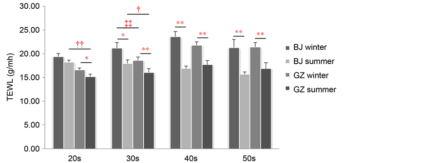 Women in their 40s and 50s had a greater difference in the TEWL between summer and winter than women in their 20s and 30s. The TEWL of women in their 20s during winter was significantly higher in Beijing women than in Guangzhou women. The TEWL of women in their 20s and 30s during summer was significantly higher in Beijing women than in Guangzhou women. There was no significant difference in the TEWL between Beijing and Guangzhou women in the other age groups.