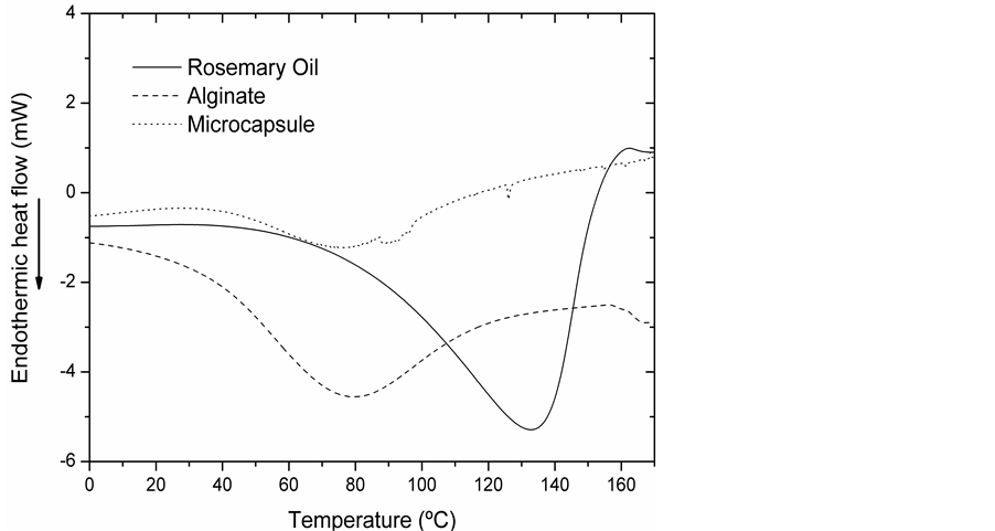 Figure 6 shows three curves corresponding to the rosemary oil, wall material and microcapsules.
