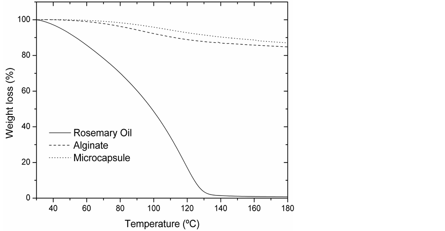 Wall material and alginatecurve presents two steps. The first one, until 100˚C is caused by the external part moisture and the second one, 100˚C - 180˚C, is due to the water present within the microcapsules.