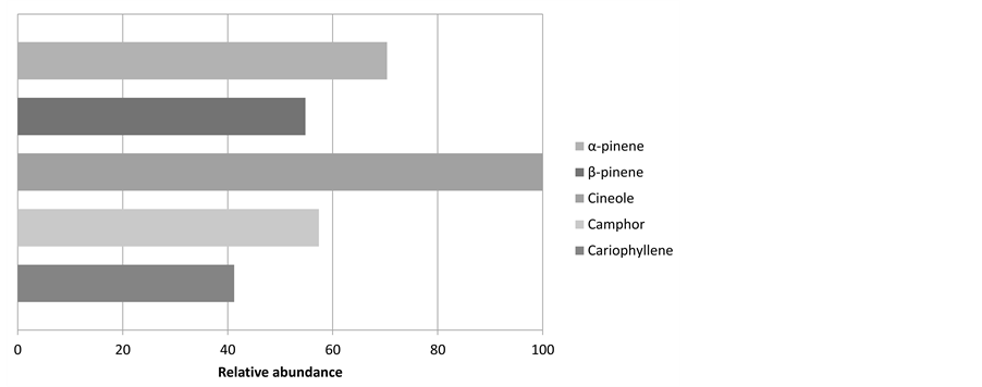 Figure 7 shows the contents of the five major components that have been identified in the samples of rosemary essential oil. α-pinene, β-pinene, cineole, camphor and cariophyllene. All of them areterpenes. Scientific literature presents the same major components (cineole, camphor, and α-pinene), which are present also in this study [22] . Some terpenes like pinene and camphor have antimicrobial properties [23] . Also, some of the main compounds found (cineole and camphor) in the rosemary essential oil have antifungal properties [24] .