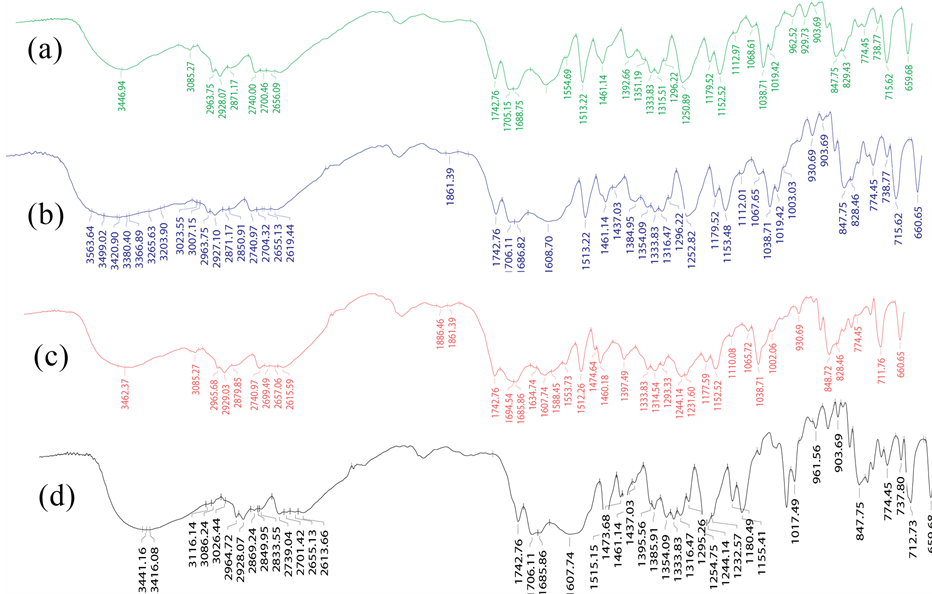 Figure 1. FTIR Spectra of (a) Pure pioglitazone; (b) Pioglitazone + Sodium CMC microspheres; (c) Pioglitazone + Carbopol 940 miscrospheres; (d) Pioglitazone + Cellulose Acetate Butrate miscrospheres.