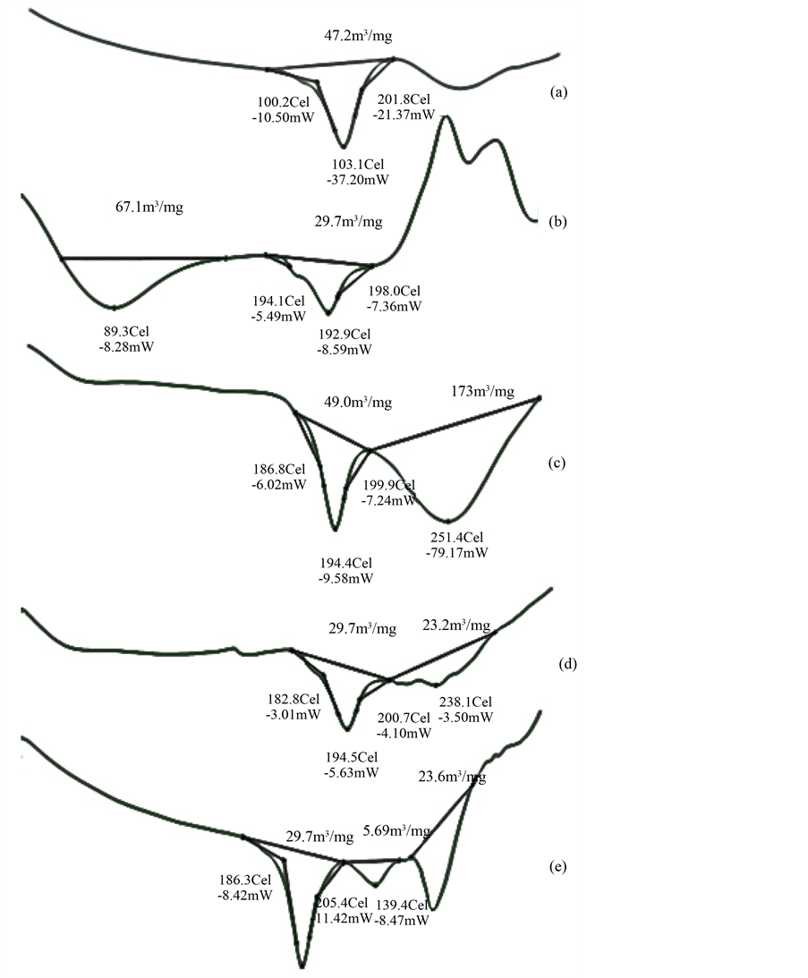 Figure 2. DSC thermograms of (a) Pure pioglitazone; (b) Pioglitazone loaded Sodium alginate microspheres; (c) Pioglitazone loaded Carbopol 934 microspheres; (d) Pioglitazone loaded HPMC microspheres; (e) Pioglitazone loaded CAB microspheres.