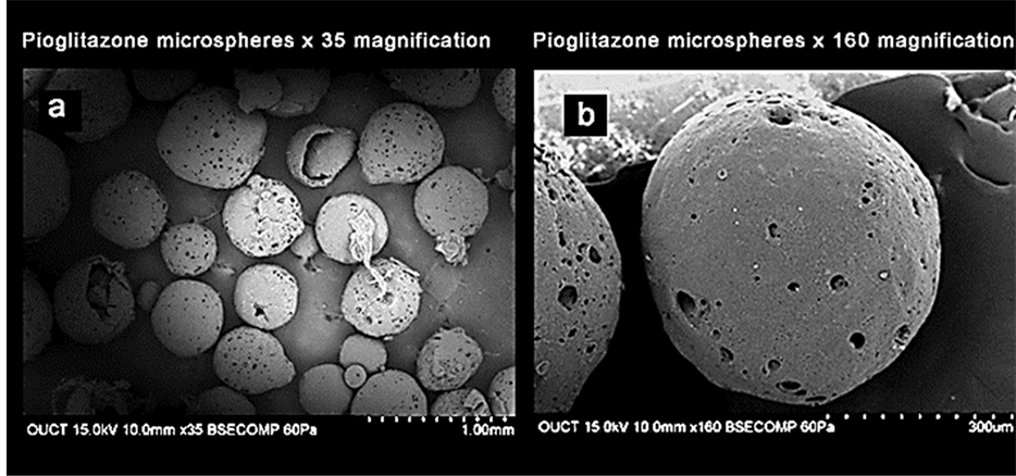 Microspheres are discrete particles that make up a multiple unit system. Recently, much emphasis has been laid on the development of microspheres dosage forms in preference to single unit systems because of their potential benefits such as increased bioavailability, reduced risk of systemic toxicity, reduced risk of local irritation and predictable gastric emptying. Microspheres systems show better reproducible pharmacokinetic behavior than conventional (monolithic) formulations. The incorporation of mucoadhesive polymers in the microspheres significantly increases the gastrointestinal transit time of microspheres [1] . It has the desired characteristics suitable for developing mucoadhesive extended release formulations, which include its solubility in acidic pH and a shorter half-life of 3 - 5 h. Due to side effects of pioglitazone HCl a sustained release medication is required to get prolonged effect with reduced fluctuations in drug plasma concentration levels. Mucoadhesive microspheres can provide the sustained release of drugs and advantage for pioglitazone HCl in the management of type-2 diabetes with a high margin of safety and reduced side effects.