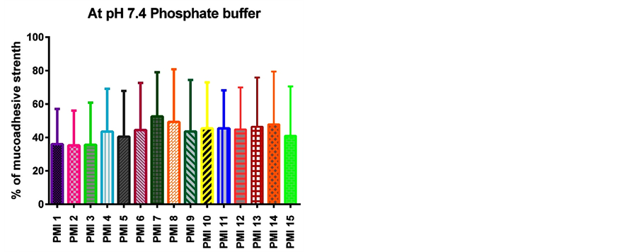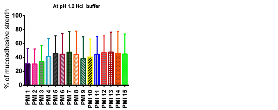 The in vitro mucoadhesive study was performed by in vitro wash off test method. The mucoadhesive strength of prepared microspheres was tested in the presence of simulated gastric fluid (SGF, pH 1.2 0.1M HCl) and simulated intestinal fluid (SIF, pH 7.4 phosphate buffer) and the results are summarized in Figure 4 and Figure 5. The mucoadhesive strength of microspheres was directly proportional to the polymer concentration in both the media. Although the maximum value of mucoadhesive strength was attained by the combination of polymers, significant mucoadhesive strengths were also shown by individual polymers in both simulated gastric and simulated intestinal fluids. The optimized formulation PMI 8 showed considerable mucoadhesive strength with a mucoadhesive time over more than 7 h.