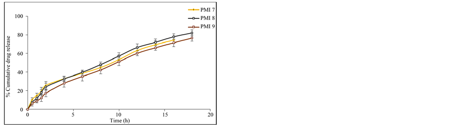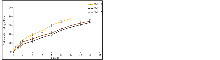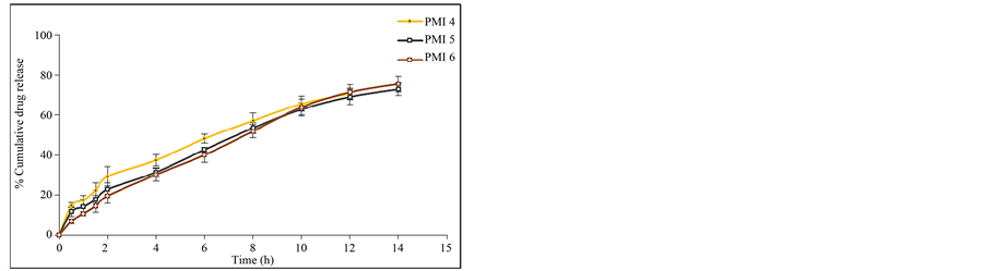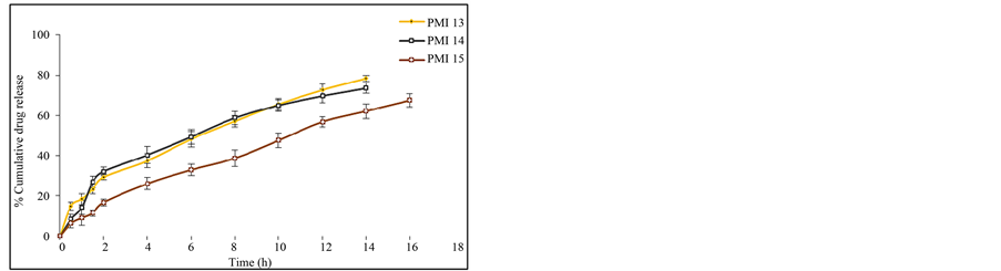 attributed to the greater binding of the drug with polymer. This is due to large amount of drug got bounded in the polymer matrix, as a result the rate of drug release from the microspheres was decreased. The in vitro release of pioglitazone hydrochloride was influenced by altering the drug to polymer ratio and the mechanism of drug release was by diffusion controlled. The percentage drug release of each of the formulation was found to be PMI 1 (60.23%), PMI 2 (57.26%), PMI 3 (51.26%), PMI 4 (70.69%), PMI 5 (72.83%), PMI 6 (75.49%), PMI 7 (74.38%), PMI 8 (82.12%), PMI 9 (76.54%), PMI 10 (74.94%), PMI 11 (66.08%), PMI 12 (69.45%), PMI 13 (78.36%), PMI 14 (73.54%), PMI 15 (67.52%) of drug release at the end of 18 h (Figures 6(a)-(e)). So it is the best formulation releasing the drug at a controlled rate for a period of 18 h increase drug absorption further increasing the bioavailability.