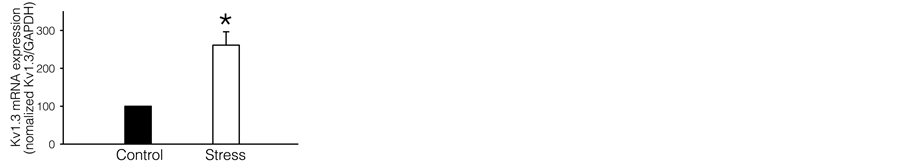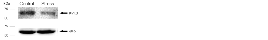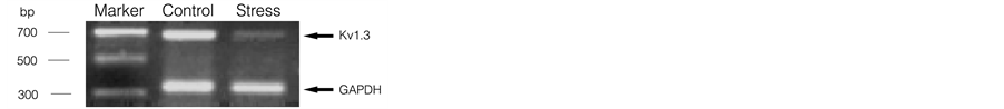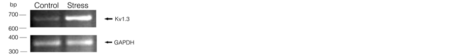Kv1.3 plays an important role during lymphocyte proliferation [15] [16] . T and B cells are the major component of splenocytes [27] . Therefore, we investigated whether Kv1.3 expression was affected by restraint stress specifically in T or B cells. Data from semiquantitative RT-PCR experiments revealed that Kv1.3 mRNA in T cells purified from restraint-stressed animals was significantly downregulated compared with that in control animals (Figure 2(a)). The mean expression in stressed mice was decreased to 65.7% ± 1.8% (Figure 2(b)). Western blotting results paralleled those of RT-PCR: T cell Kv1.3 protein expression in the stressed mice was greatly downregulated compared with that in control mice (Figure 2(c)). We then investigated the effect of restraint stress on Kv1.3 expression in B lymphocyte. Interestingly, the semiquantitative RT-PCR results demonstrated that Kv1.3 mRNA level in B lymphocytes from stressed mice was increased to 261.2% ± 35.2% (Figure 2(d) and Figure 2(e)). Kv1.3 protein expression was also upregulated in B cells of stressed mice (Figure 2(f)). Therefore, restraint stress downregulated Kv1.3 protein in T lymphocytes and upregulated it in B lymphocytes, which was at least partly due to the changes in gene expression.