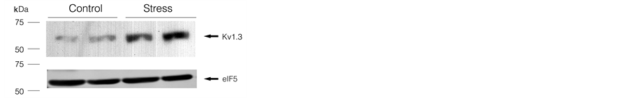 Cells (4.0 ´ 107) were sonicated in 0.1 ml of ice-cold ionic detergent buffer (10 mM Tris-HCl pH 7.4, 1 mM EDTA, 1 mM PMSF, 1% Triton X-100, 0.42 M NaCl, and 0.5 mM DTT). Protein concentrations were measured by the Lowry method [26] . Cell lysates (50 mg/lane) were subjected to SDS-PAGE and electrotransferred onto PVDF membrane. After being blocked in 5% skim milk and TBS (0.15 mM NaCl and 20 mM Tris-HCl, pH 7.6) at 4˚C overnight, the membrane was incubated with the antibody against Kv1.3 for 2 h in GENT solution (0.15 mM NaCl, 5 mM EDTA, pH 8.0, 50 mM Tris-HCl, pH 7.6, 0.25% gelatin, and 0.05% Triton X-100) and then with a horseradish peroxidase-labeled secondary antibody against rabbit IgG (Zymed Laboratories Inc., San Francisco, CA). Kv1.3 and its derivatives blotted onto the membrane were visualized by use of an enhanced chemiluminescene detection system (Amersham Biosciences). eIF5 was used as a control protein in these samples. The anti-eIF5 antibody was obtained from Santa Cruz Biotechnology.