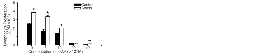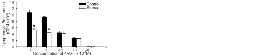 Because restraint stress has the potential to affect various physiologic functions in mammals, we employed various Kv1.3 channel specific blockers (quinine, 4-AP and TEA) to examine a possible cause-and-effect relationship between Kv1.3 and stress-affected lymphocyte proliferation and to further determine K+ channel function in restraint stress. The pharmacological studies (Figure 3 and Figure 4) have demonstrated that Kv1.3 blockers attenuated the differences between stressed and control mice in proliferation of both T and B lymphocytes. The difference in Kv1.3 channel function caused by its expression change between control and stressed mice was ameliorated by increasing Kv1.3 blocker concentrations, and as a result, the difference in lymphocyte proliferation between the 2 groups was also decreased. In addition, the results supported the notion that restraint stress modulated T and B cell proliferation mediated by Kv1.3. Recently, it has been reported that TLR9 [37] , IL-10/STAT3 pathway [40] , and oxidative stress [41] also play an essential role in chronic stress-induced immune suppression. The potential cross talk between these signal pathways should be investigated.